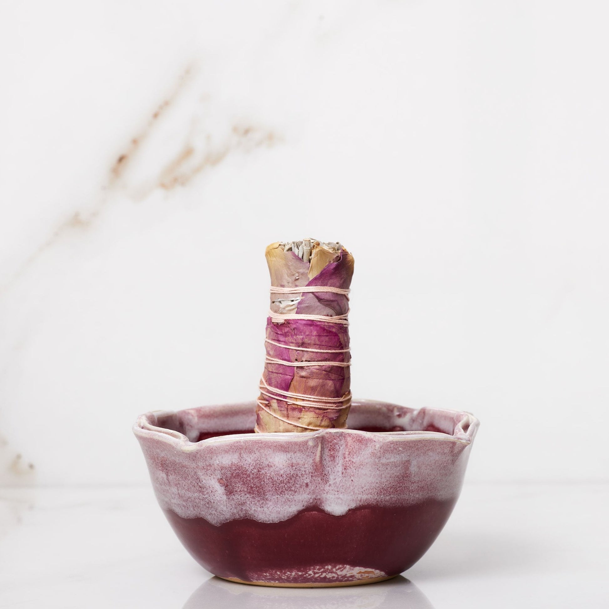 This cranberry lotus shaped Sage/smudge bowl fits neatly and comfortably in the palm of your hand while cleansing your home. The bowl conveniently catches any stray ash. When you are done simply turn your sage stick upside down and stuff out in the middle ring.