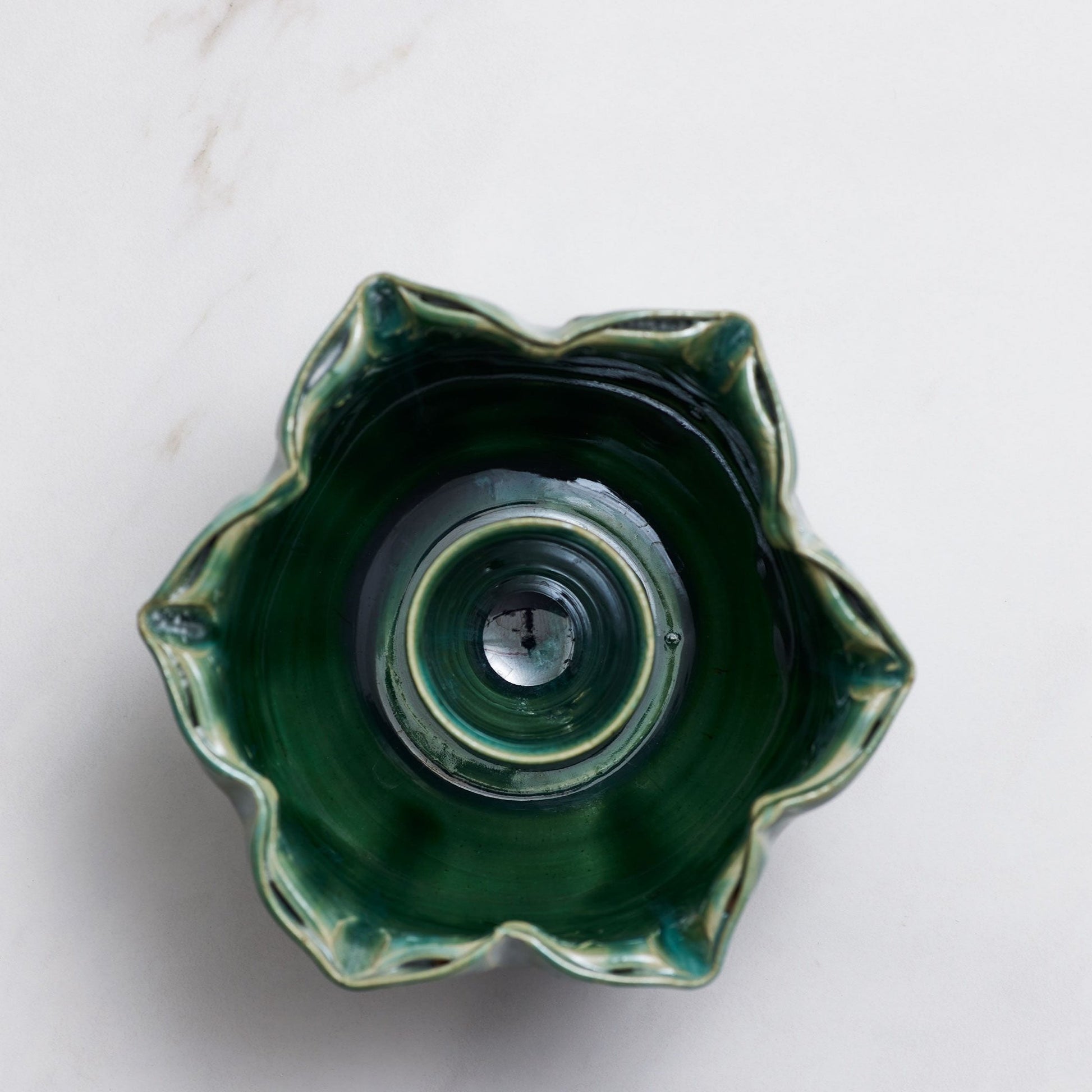 This cute little green lotus-shaped Sage/smudge bowl fits neatly and comfortably in the palm of your hand while cleansing your home. The bowl conveniently catches any stray ash. When you are done simply turn your sage stick upside down and stuff out in the middle ring.