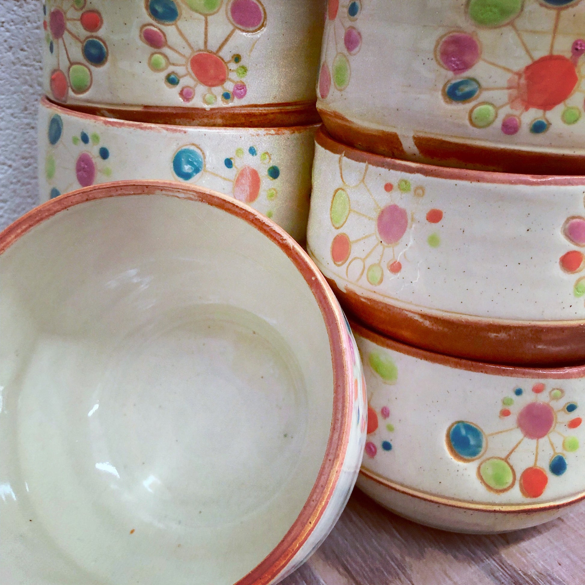Originally called Mid Century Dinnerware, customers continually called and asked to purchase one of my happy pots, the ones with all the happy colors & the happy pattern. In response, I changed the name to “The Happy Collection”. An active way to bring joy into your daily routine.