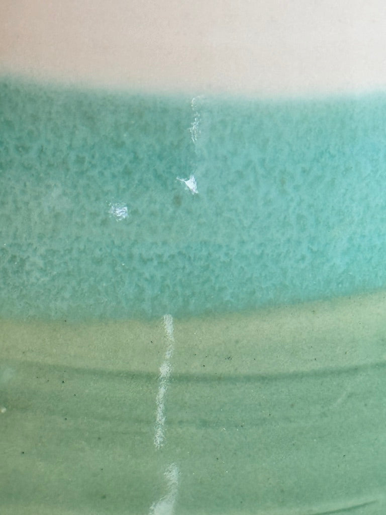 The pots are thrown by hand on the wheel. The bases are trimmed. Once the pots are bone dry are fired in the kiln to 1000 degrees (the bisque fire) which dries and strengthens them sufficiently for glazing. They are dip glazed before I fire them again to 2233 degrees.